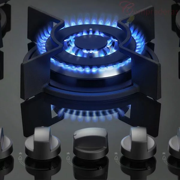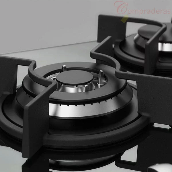 5 zonas de cocción para la preparación de alimentos con quemador Triple llama ultra fuerte de 3700 W de potencia para alcanzar temperaturas más altas en menos tiempo, proporciona mayor rapidez en la preparación de los alimentos para cocinar recetas mas grandes.
