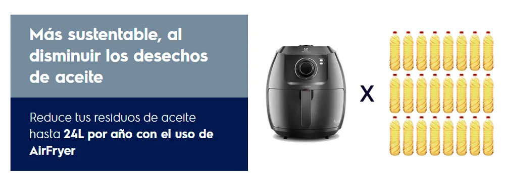 La freidora de Aire Electrolux Family Efficient te permite evitar desechar hasta 24 litros de aceite al año, contribuyendo así a la sostenibilidad. Ayundando de esta manera a tu salud y al medio ambiente.