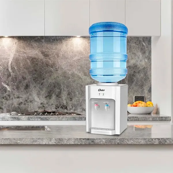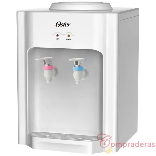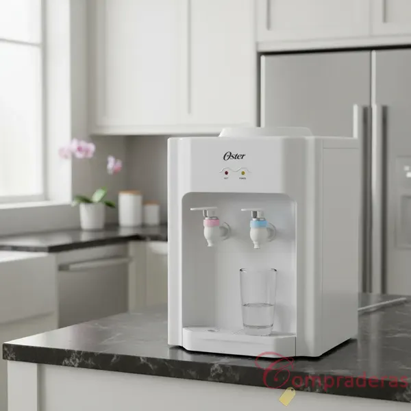 Dispensador de agua Oster de mesa, Cuenta con un elegante acabado Blanco, 2 opciones de temperatura agua fría y agua caliente.